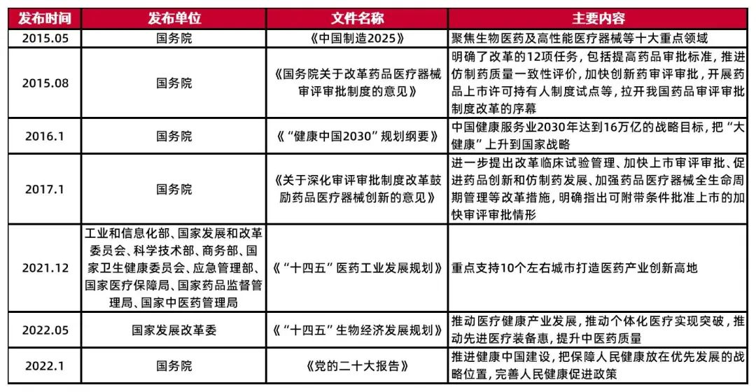 来源:澎湃新闻澎湃号政务字号 01我国生物医药产业发展现状(一)政策端:医药健康产业上升到国家战略高度。《中国制造2025》明确提出要聚焦生物医药及高性能医疗器械等十大重点领域。《健康中国2030》提出中国健康服务业2030年达到16万亿的战略目标。《“十四五”医药工…